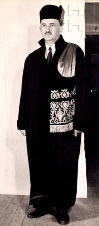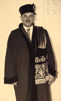 En la primera, Neufert aparede de ‘toga y birrete’ en su nombramiento como ‘Honoris causa’ . La foto no es ‘promediable’ pues no aparece el cuerpo completo para proporcionar con algún objeto.