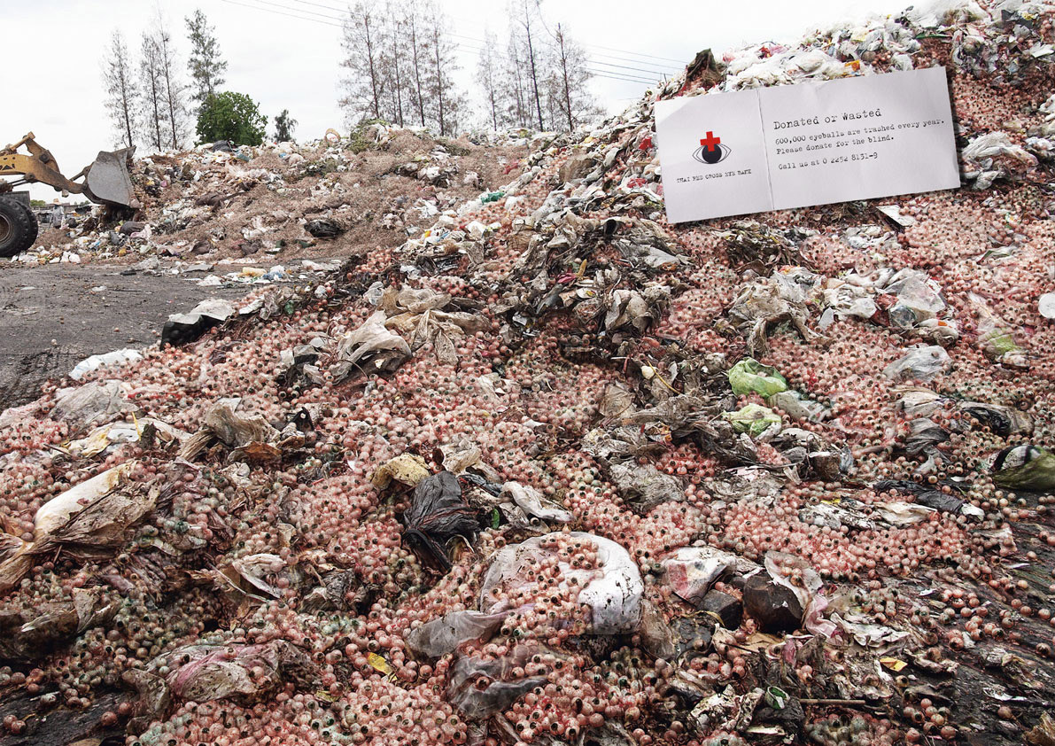Pues si son ojitos. el cartel lee: Donados o desperdiciados. 600.000 ojos son tirados a la basura cada anyo. Por favor donad al ciego.