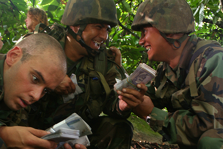 «Mis manos comenzaron a temblar y luego mi cuerpo. Levanté la cabeza para notificar a mis dos amigos, pero ellos lo habían descubierto también un poco más arriba. ¡Era dinero puro y en efectivo!. No acertamos siquiera a celebrar. Estábamos estupefactos, como hechizados, y caímos a en un extraño trance, como si hubiéramos bebido algún brebaje de plantas exóticas, como si flotáramos en el aire. Sólo coincidíamos en desempacar (los fajos) rompiendo el grueso plástico, cada uno en lo suyo, sentado a un lado del hueco, llenando los bolsillos de nuestros uniformes camuflados», contó un soldado.
