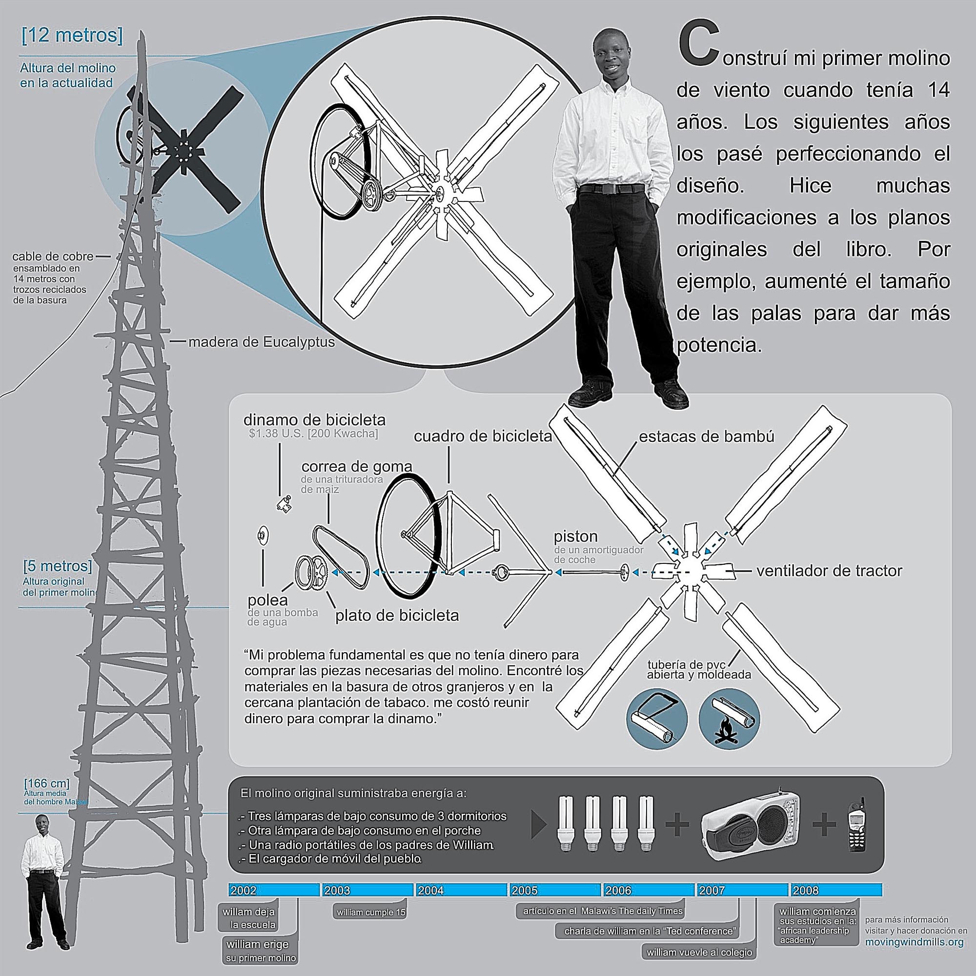 A pesar de no estar escolarizado, William no carecía de ingenio y ganas de aprender sometido, desde que tenía uso de razón, por el instinto de supervivencia. Abandonó la escuela pero devoraba las revistas y los viejos y carcomidos libros que alguna ONG depositaba en en club social de la aldea. A sus manos llegó un ejemplar de una publicación educativa de ciencia que explicaba como convertir el viento en electricidad. Manos a la obra. Era septiembre de 2002.