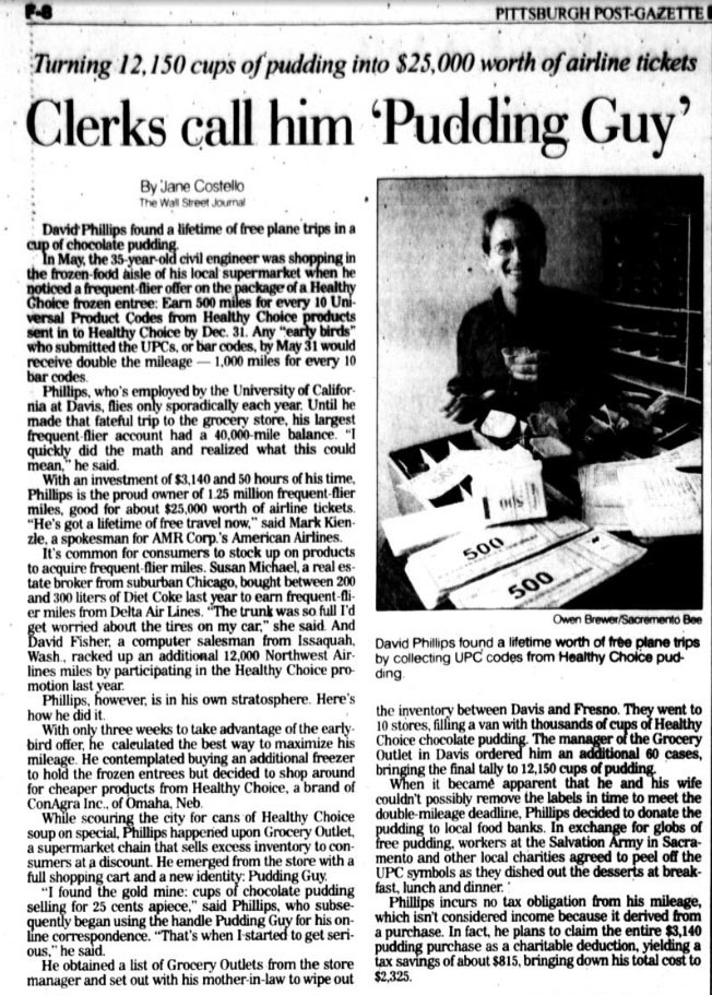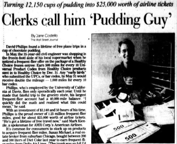 Una tarde de primavera de 1999, el ingeniero norteamericano David Phillips se encontraba de compras en el ‘super del barrio’ cuando detuvo su mirada en una típica y llamativa oferta de flanes. La compañía Healthy Choice Foods ofrecía puntos y kilómetros de vuelo por la compra de un ‘pack’ de sus productos. De mente ágil y entrenada ‘calculadora neuronal’ el señor David cayó en la cuenta de que el premio ofrecido por cada unidad de pudin era mayor que el valor real de la unidad de producto. En dos días compró más de 12.000 flanes.