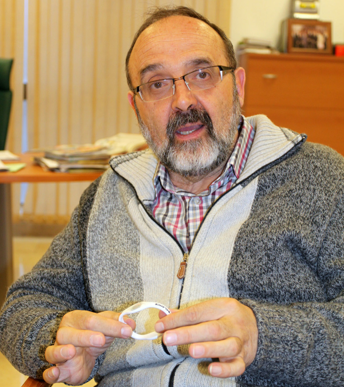 D. José María Múgica, en su despacho de la OCU con la timo-pulsera en sus manos.