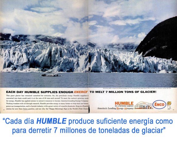 Anuncio aparecido en la revista Life en febrero de 1962: » […] Este glaciar gigante se ha mantenido durante siglos sin derretir. Sin embargo, la energía proporcionada por el petroleo de Humble  – si se convierte en calor – puede hacer que se derrita a un ritmo de 80 toneladas cada segundo […].»  Uno de los símbolos de la lucha contra el cambio climático utilizado como banco de pruebas para la industria del petroleo.  Hoy podría ser perfectamente  una campaña de concienciación de Greenpeace