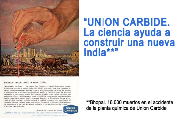 Un ejemplo brutal de la ironía retrospectiva de la historia cuando se mezcla fatalidad con la ineptitud del desarrollo mal concebido. Anuncio de 1962. 22 años antes de la más grave catástrofe industrial de la historia. El accidente de la fábrica de pesticidas que la misma empresa construyó con graves deficiencias en Bhopal. Lo realmente irónico de la campaña es la imagen del anuncio derramando como ‘elixir’ o ‘abono al desarrollo’ el mismo engendro que dos décadas más tarde iba a provocar la muerte y contaminación de toda una comarca.