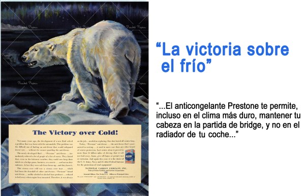 Años cuarenta. Otro de los ‘futuros’ grandes símbolos contra el cambio climático antropogénico al servicio de una empresa de anticongelantes. Una campaña que hoy no pasaría el filtro ni del peor fabricante de braseros para jubilados, teniendo en cuenta  el papel de ‘emprendedor ‘ que le está tocando protagonizar al Oso Polar en su deteriorado hábitat.