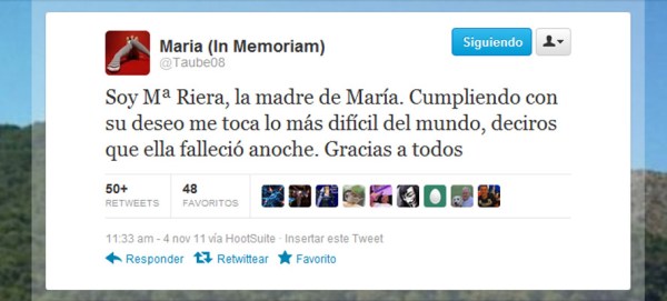 La muerte en Twitter es aún más gélida, porque se confunde con la desidia. Cuando alguien fallece su cuenta queda congelada en el tiempo, igual que si la decisión hubiera sido simplemente abandonarla. Pero este caso fue impactante. María, una joven mallorquina enferma de cáncer, no quería el silencio como adiós eterno y maquinó una despedida meditada. Barruntándose el final quiso agradecer el apoyo y cariño recibidos en Twitter. Y dejó a su madre la horrible y maravillosa tarea de regalar a todos sus seguidores mensajes personalizados que fabricó durante el final de su calvario. Tal vez para emborracharse de cariño, afecto y endorfinas al escribirlos, tal vez para perpetuar su memoria al entregarlos. El caso es que durante varios días su madre fue repartiendo las misivas a cientos de seguidores provocando un aluvión de lagrimones detrás de esas gélidas pantallas. Ni yo ni muchos la conocíamos, pero participamos socialmente del regalo de empatía que nos dejó María. Una lección anónima del hombre frente a la máquina. Un paso más en la humanización de las redes sociales… Luego me di cuenta que me seguía y me sentí tremendamente frustrado por no haber podido compartir su dolor con ella antes.