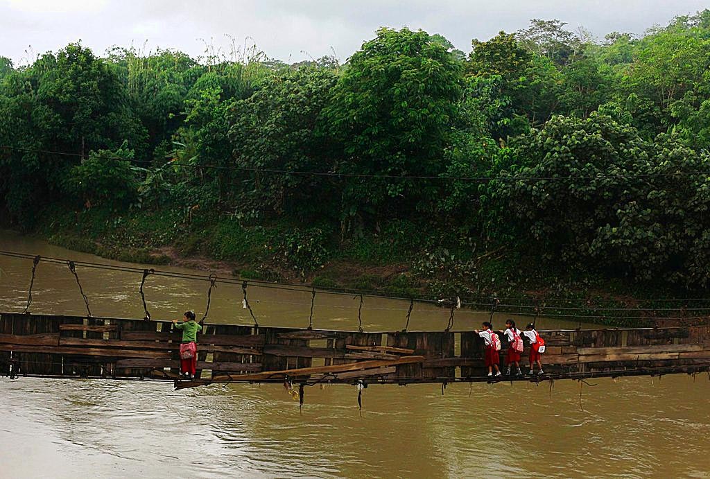 17 de enero de 2012. Las lluvias torrenciales arrastran todo tipo de maleza sobre el crecido río Ciberang, a su paso por la aldea Sanghiang Tanjung, en la provincia Indonesia de Bateng. La fuerza de la corrientegolpea y daña los pilares del puente comunal (construido en 2001) que une el pueblo con el suburbio de la escuela. El paso queda muy dañado pero no impide que desde ese día los niños lo sigan cruzando a duras penas para ahorrarse 30 minutos de rodeo. Un fotógrafo de reuters estaba allí para contarlo.