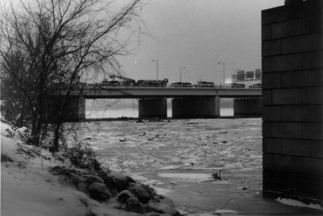 El Potomac congelado desde el puente siniestrado. Restos del avión esparcidos por el hielo. Fuente