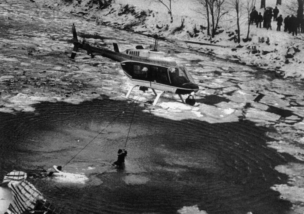 Un pequeño grupo de transeúntes civiles se acercó a la ribera con un todo terreno para intentar remolcar a algún pasajero, pero el trabajo era imposible. Al mismo tiempo que intentaban desplegar una linea de rescate desde la orilla con el cable de tracción del coche, el primer helicóptero de la policía llegaba al lugar del accidente. Sin apenas detenerse acercó sus dos patines de aterrizaje al lugar donde flotaban temblorosos los últimos pasajeros vivos. Pero ninguno de ellos lograba asirse con la suficiente fuerza a la aeronave. Regresó más tarde con un cable metálico atado a un flotador. Varias cámaras llevaban ya tiempo grabando.