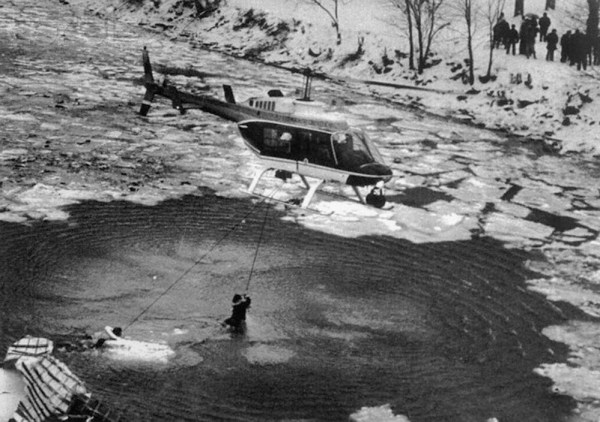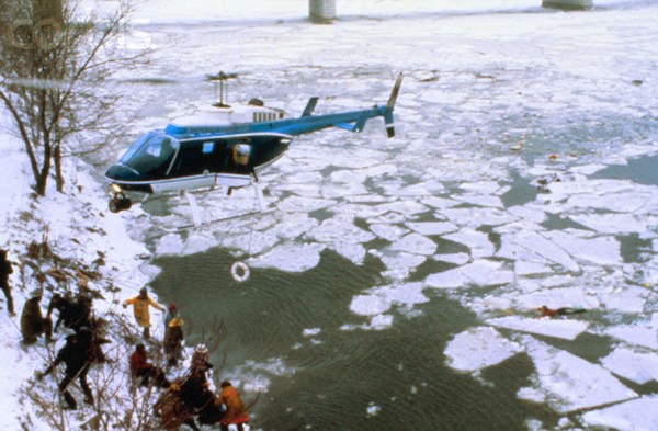 Las primera fuerza oficial en llegar fue un remolcador del servicio de guardacostas que estaba de paso. Intentó acercarse al amasijo de hierros que asomaba sobre varios de los témpanos congelados del Potomac. Sin el equipamiento adecuado, intentó echar los flotadores a los supervivientes que, aturdidos por el impacto y por el frío, eran incapaces de asirse a ellos. Habían transcurrido sólo 10 minutos desde el accidente.