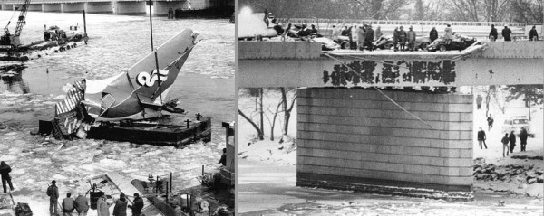 Tan solo 400 metros más allá del final de pista, el avión se vino a tierra sobre el puente de la calle 14, en el río Potomac, antes de terminar en sus aguas congeladas. Se llevó consigo seis automóviles y un camión. Cuatro de los conductores murieron en el primer impacto con el puente. Sólo 16 personas de las que salieron despedidas del avión, se rescataron con vida. El resto se hundieron con la aeronave en las profundidades del caudaloso río. Temperatura en superficie, 20 grados bajo cero.