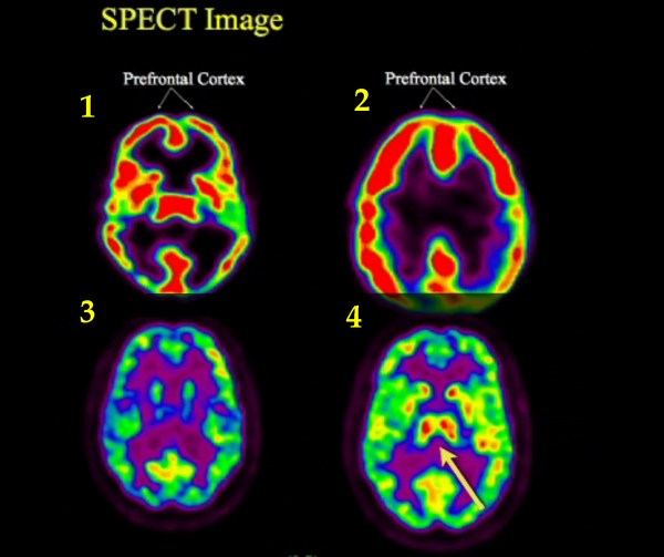 Simulación de un ‘SPECT‘ del cerebro de Becks en las cuatro fases de su agonía: 1.- Escaner en estado normal. Flujo distribuido. 2.- Lóbulos frontales con mayor flujo. Se pone atención en los músculos. Apenas hay actividad en el centro o de ‘recuerdos’. 3.- Flujo desaparece. Casi no hay actividad. 4.- La parte central o de recuerdos se ilumina de nuevo, al pensar en su familia.