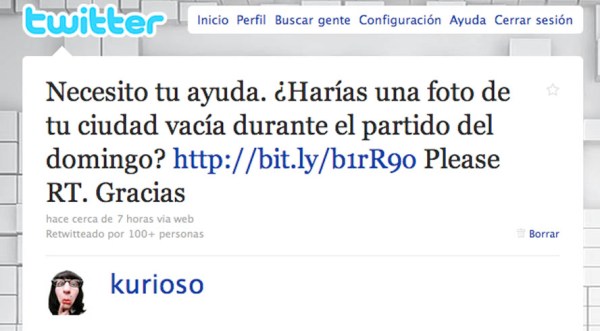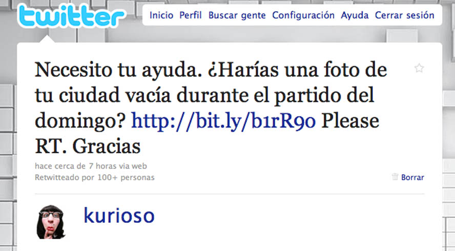 La consigna era salir a la calle armado con cualquier tipo de cámara o móvil mientras casi 17 millones de personas permanecían pegados a sus televisores. Un paseo insólito por tu ciudad tan desnuda como desierta, disparando con la cámara a todo aquello que ‘no se mueva’. El resultado ha sido un conjunto de más de 700 fotografías realizadas en el intervalo del partido y con el mismo leitmotiv. Para la mejor foto, el diario lainformacion.com -colaboradora del proyecto- tiene preparada una fantástica cámara LOMO. NOTA*** Ya hay ganador. Laura Reyero se llevó la LOMO por esta foto. ¡Enhorabuena!